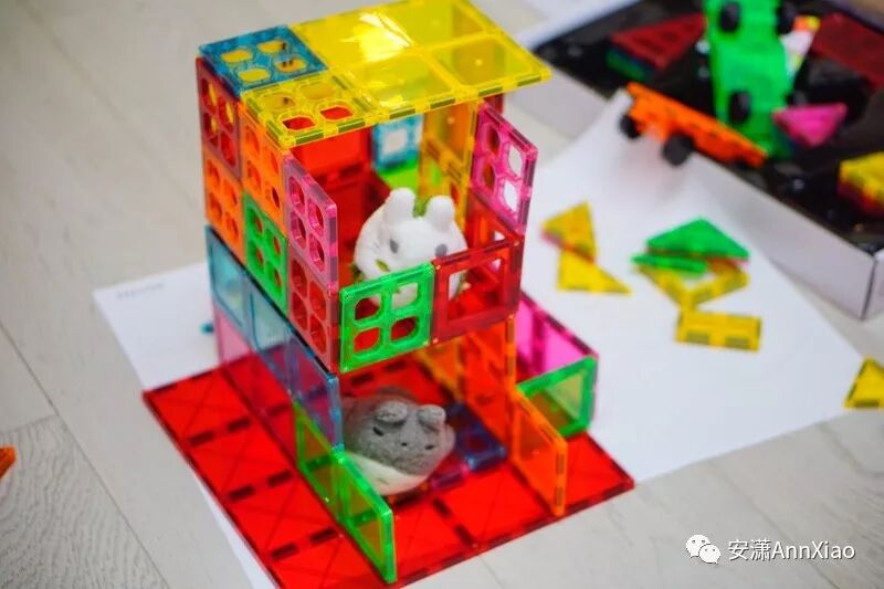 磁力片当然最常玩的,就是各种房屋和场景搭建,可以搭城堡、搭旅馆、搭娃娃屋。