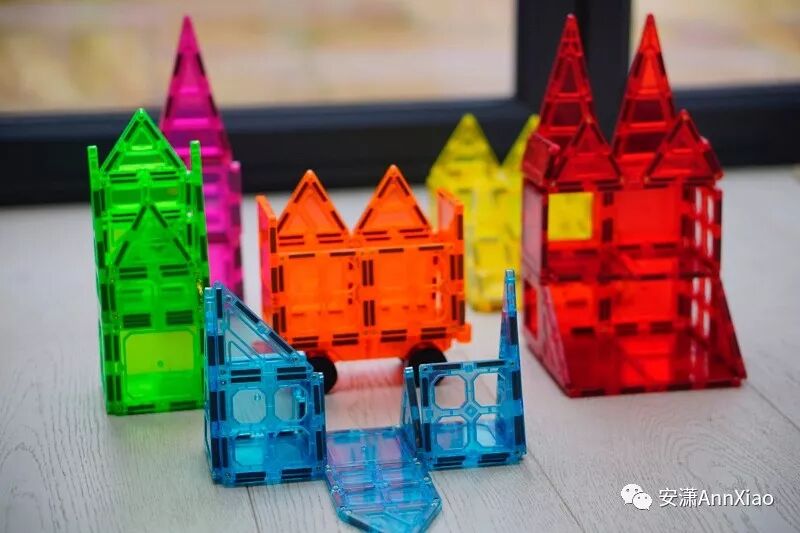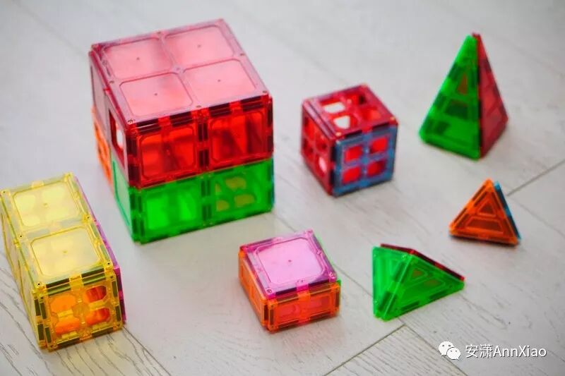 对3、4岁和再大一些的孩子来说,磁力片是通过一片片的平面图形拼出立体结构,不像木制积木本身就是三维体块,因此磁力片对孩子的空间想象的训练以及三维几何的理解也很有帮助。