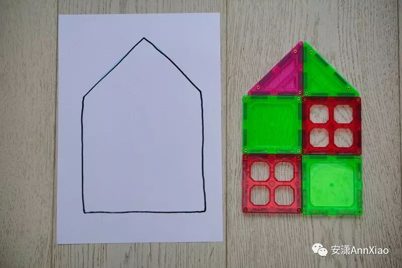 也可以爸妈拼完以后,在白纸上画出轮廓,看看孩子能不能找到正确的磁力片拼出这个图形呢?