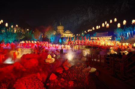 千龙网4月17日登封讯(记者 石磊) 4月17日晚8:00“网上看河南”采风团一行70余人观看了中岳嵩山实景演出《禅宗少林》音乐大典。据了解,被誉为“中国山水实景演出第一人”的著名剧作家梅帅元担任总策划和制作人,全球最具影响力的华人作曲家谭盾担任音乐原创、艺术总监,著名舞蹈家黄豆豆担任舞蹈设计,著名学者易中天担任禅学顾问,中国佛教协会副会长、少林寺方丈释永信担任少林文化顾问,舞美、灯光及音响设计制作均由国际一流专业设计师负责设计。 内容方面,适应现代受众的审美需求和愉悦方式,对中原文化资源进行了独特的、富有创意的开掘和提炼,通过600名僧俗表演和唱诵,着力表现禅宗潜心静修的文化内涵和少林禅武合一的历史内涵。形式方面,运用多种先进科技手段强化演出的现场情景感受,极大丰富了实景演出这一新兴的艺术表现形式。通过两万多平方米场地设置500多个数码控制音响,用88个古筝演奏“花流水”,近2000多盏灯组成艺术灯光,180度以上的全景视角等表现手段,给观众带来了强烈的听觉和视觉震撼。借助艺术创新,《禅宗少林》音乐大典对一向不可言说的禅宗文化进行了现代包装和解读,成为大众喜爱、有较高市场占有率的演艺产品。