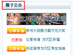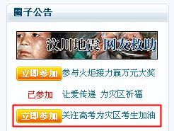 二、在模块中找到“关注高考为灾区考生加油”,点击该行的“立即参加”按钮后保存。见图2