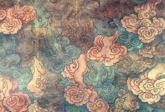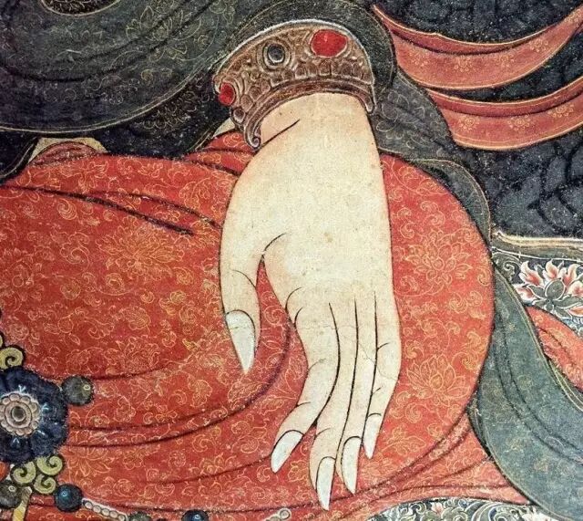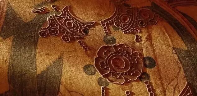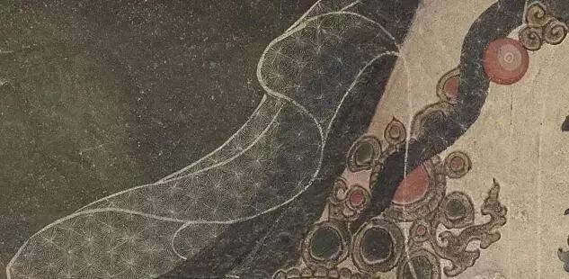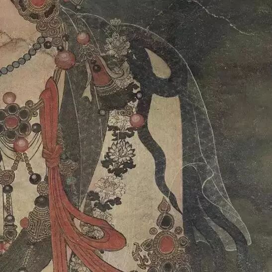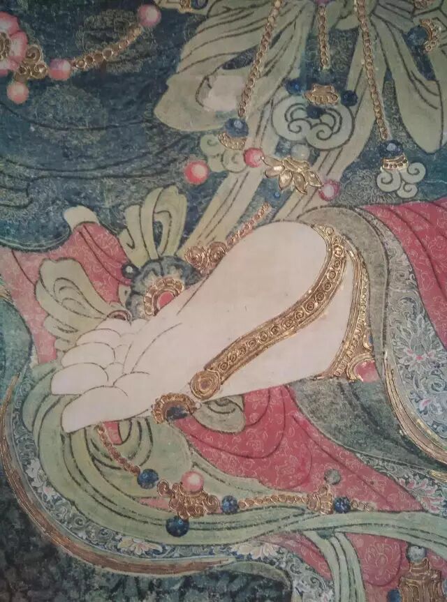 细节胜过漫天神佛的判研:每件环珮璎珞,都有沥粉堆金,每件裙袍衫裳,必有暗金花纹随着皱褶流动。这样的细节,已经超越一幅画的呈现,你要凑得足够近,才能看清这些鲜活的闪烁。在复制品上,它们是混沌的,不能流动的。真迹上的暗涌,简直想拥有同款面料做飘逸的衫,也想感慨这不重要的花纹才是最感动我的全部。