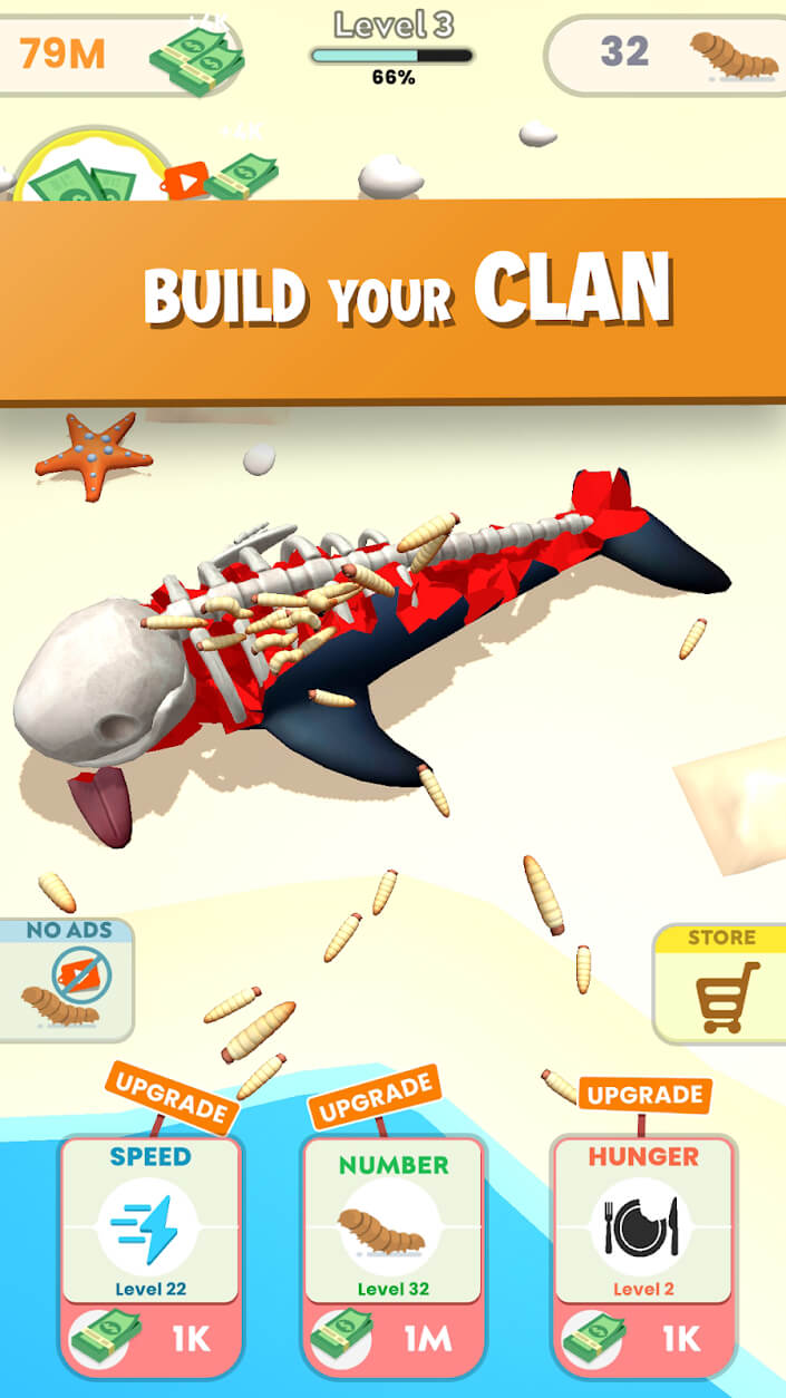 《Idle Maggots》的玩法非常简单,你只需要购买蛆虫,小可爱们就会自动蚕食关卡中的各种动物尸体。当然,为了提升蚕食的效率,你可以选择增加数量、升级速度以及扩大蛆虫们的胃口,让蚕食的效率得到的幅度的提升。每个关卡中都准备了一种常见生物的尸体。如果你希望跳过当前关卡也不是没有办法,欣赏一下广告就能轻松拿开启后续关卡。当然,开启新的区域还是要将当前区域的所有关卡全部开启才可以的。
