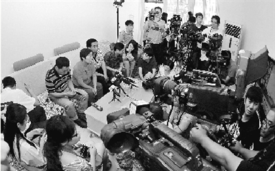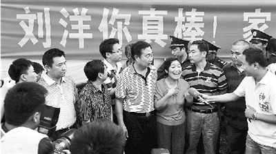 下午2∶00,刘洋父母所在的小区就搭起了露天看台,看台中央架好一台大电视机供大家观看直播,刘洋父母家中更是被数家媒体围了个水泄不通。据不完全统计,来访的包括中央电视台、凤凰卫视、香港亚视新闻等省内外媒体共计40多家。3点多,刘洋的爸爸、妈妈、舅舅、姑父从房间里走出来和媒体打招呼后便在电视机前坐定。