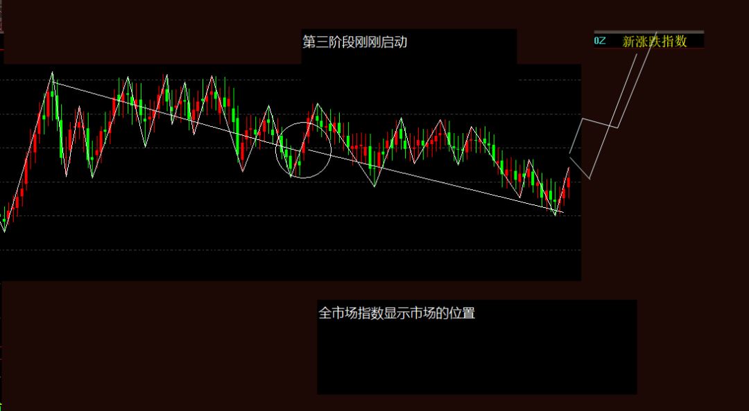 指数,我们看到创业板块领涨,那么看看谁在涨,谁在领导指数上涨,打开创业板流通市值排行,看到宁德时代领先,还有一些新能源股票也是排行前面,这样新能源上涨的同时直接带领创业板指数上涨,这就是客观去看待指数上涨,当然我们还要看全市场指数,这是确定市场趋势阶段的根本,研究发现,现在全市场指数还在启动阶段,是牛市第三阶段启动阶段,这是市场的本质,所以大家不必为了胳臂指数的大涨惊慌,因为市场第三阶段才开始。