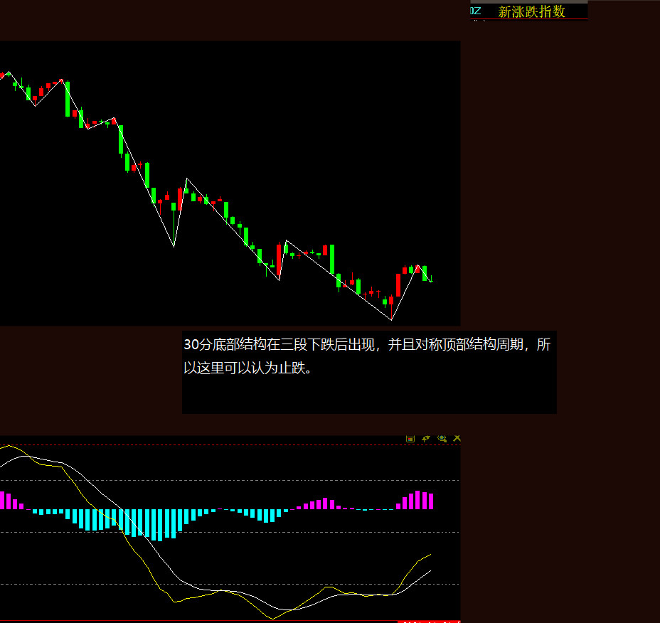 指数,市场指数今日出现30分顶底结构的底部,这是一个挑这个结束的信号,当然是标准三段下跌结束后的底部结构才会有此信号,这个信号才会可靠,那么前面见顶的传统指数就会出现横盘等待了。