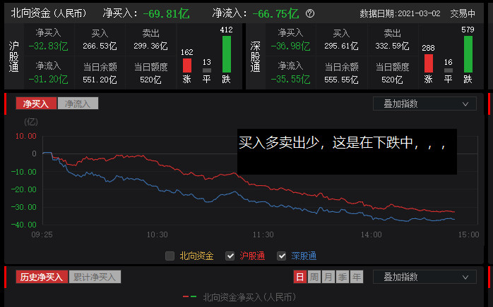 资金,场外资金会有一个明显下跌,说明跟风资金撤离的比较厉害,当然他们也在观望,如果后面形成赚钱效应还是会重新进场的,这就是市场资金,我们主要是看趋势阶段的,短期没有前瞻性。北向资金不一样,当然在一个传统指数下跌趋势下,他是会有所卖出的,特别是下跌中间阶段,北向资金也会卖出,因为他们在做短期调仓,形成短期热点波段交易,但是散户也不可以做,因为你不是主导,当然总体上北向资金还是买入的,并且到了下跌末端就是连续买入,这个情况也可以作为判断传统指数是否止跌的标准。