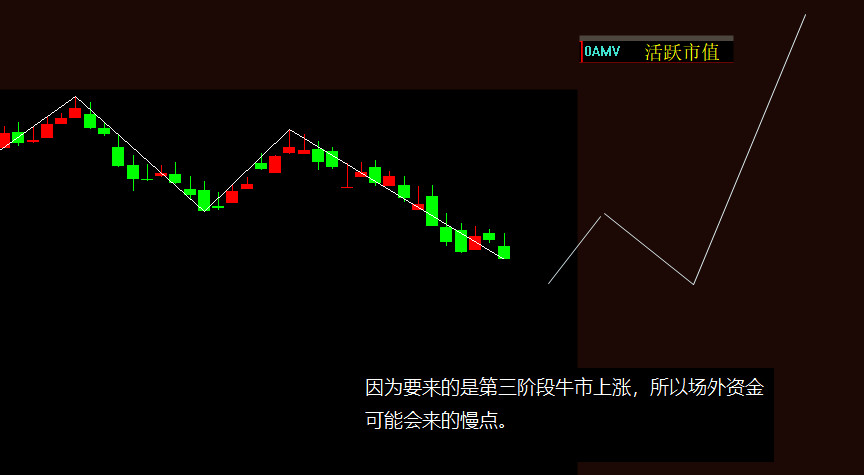 今日市场既然你预示大跌,说明上周五短期反弹结束,今日开始中间阶段下半场下跌,当然我们如果用通俗的话来讲就是需要两次新低才会构建完整的底部结构,到时才会止跌启动牛市第三阶段上涨。