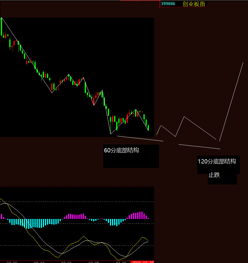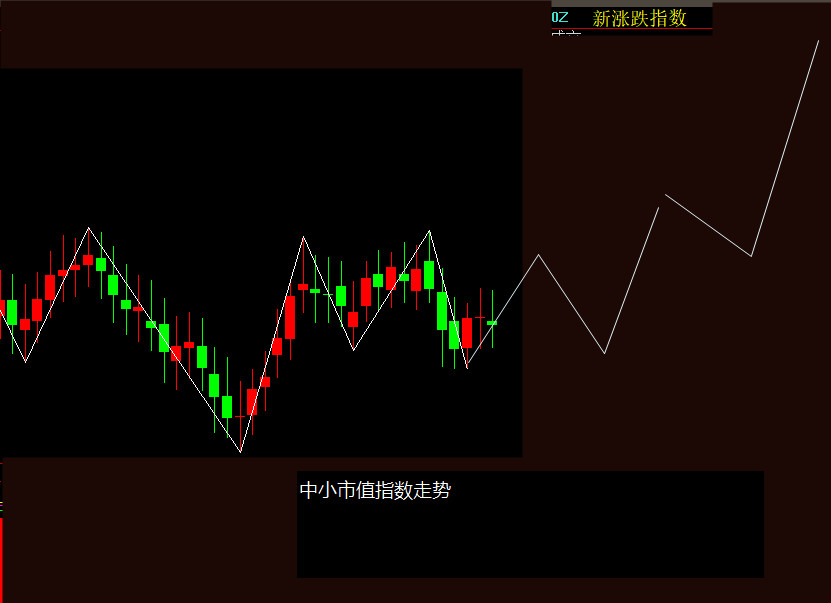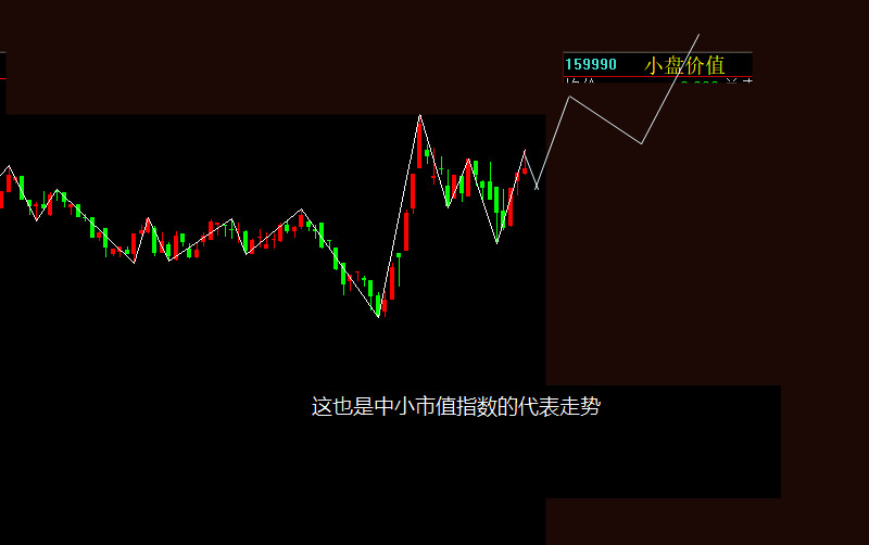 指数,传统指数看,今日是中间阶段下跌下半场开始,当然从盘面看明显下跌力度比前半场小,这也说明后面将会以时间下跌为主,空间上就是两次新低了,第一次新低从明日就能开始,然后构建60分底部结构,后面再来新低构建120分以上的底部结构,这样结束此次传统指数下跌,也是结束牛市中间阶段第二次回调。中小市值指数今日也出现回调,但是明显比传统指数来的小,这也是前面说的市场变化,传统指数大跌,中小市值指数小跌或者抗跌,传统指数反弹中小市值上涨,那么中小市值走势就如下图了。