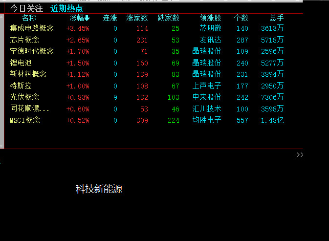 热点,现在看来集中在科技和新能源上,科技短期是芯片,集成电路冲在前面,后面5G应用会长期补涨,因为短期的概念是补芯,但是长期是5G下的各类应用出现,所以这个板块将会是长期的,注意这类股票的长期操作。