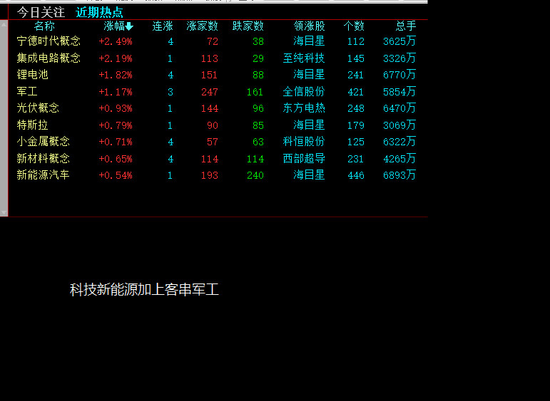 热点,虽然一个板块不是很明显,但是科技,新能源,军工客串是比较明显的方向,也许后面就会越来越明显一点,也就是单独一个板块猛烈上涨,这样会在科技的细分板块中出现情况。