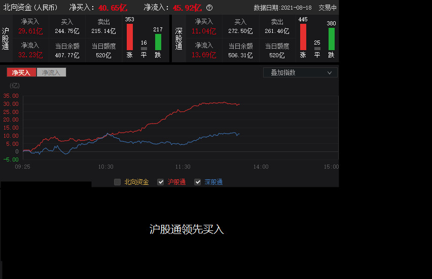 资金:场外资金指数也是很靠谱的,他描述了市场价值的多少,那么见顶就是高位,高位就是总的价值高位,那么在这么高位的换手(机构卖出散户买入)那么成交量一定是巨大的,也一定是超越前面几次牛市以来的波段高点成交量的,所以这是有一个贴的见顶指标,好好收藏即可,现在看来一目了然,早着呢,放心!北向资金今日继续买入,连续几天的逆势买入给了我们判断市场短期涨跌依据,今日又是买入,沪股通的领先买入,这给我们市场描绘了权重爆发的场景,看看后面怎么连续,应该是权重稳盘,三驾马车领涨,这是本次牛市第三阶段的特点。
