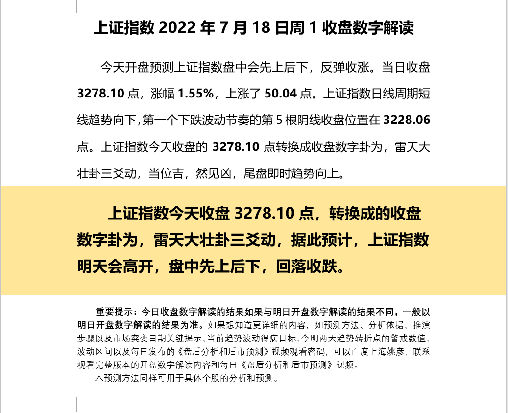 上证解读指数2022年7月19日周2开盘数字解读