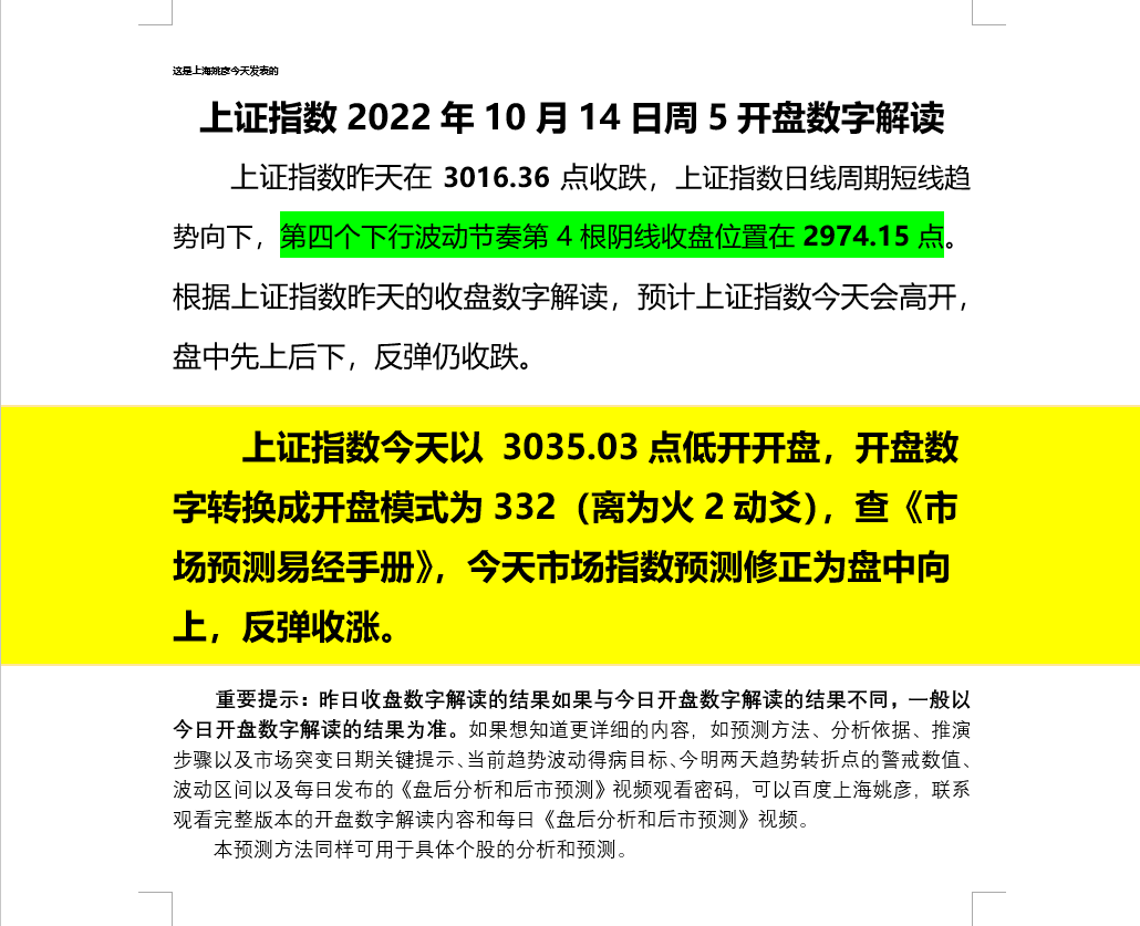 上证指数2022年10月14日周5开盘数字解读