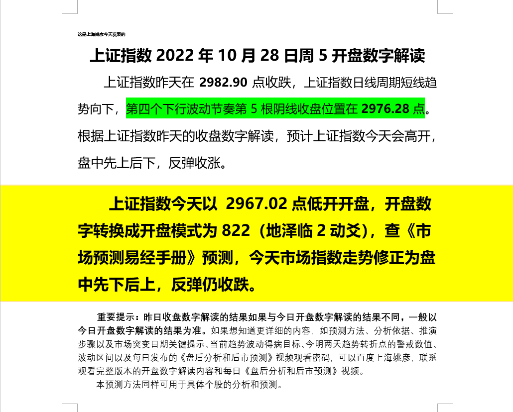 上证指数2022年10月28日周5开盘数字解读