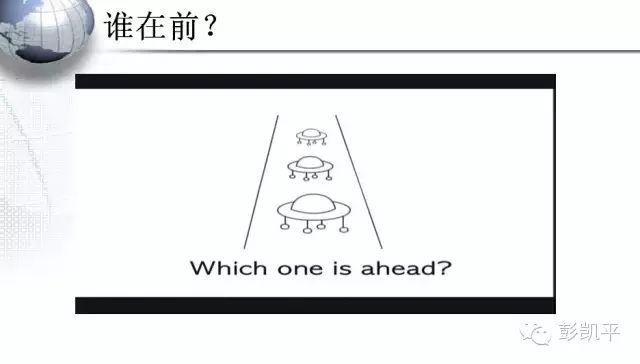 另一个著名的研究,是斯坦福大学的一位心理学家做的经典实验。假设有三个怪物排成一列往前走,你觉得是“哪个怪物”走在最前面。一般来讲,中国人容易把下面这个怪物看成最前面的怪物;而说英语的西方人,会把最上面的怪物看成走在最前面的怪物。为什么会是这样的呢?我们一直都不知道答案。直到2001年,斯坦福大学的心理学家发现,这可能与中、西方人对时间的表达有关系。比如说,要开一个会,原定于“下星期三”的会将“提前两天”开。按中国人的思维习惯就会以为时间改到了“下星期一”;但是如果把这个问题讲给说英文的人听,很多说英文的美国人,就会认为这个会是改在了“星期五”。这是因为他们的方向是往外面走,而不是像我们中国人是往里面走。