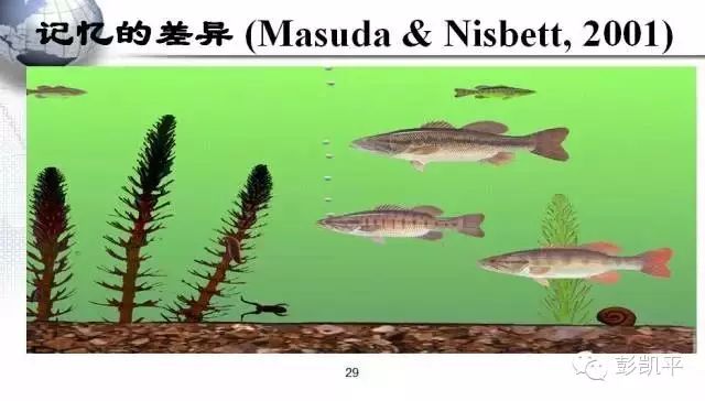 我的老师尼斯贝特(Nisbett)做过一个很有意思的研究。它让全世界不同的人看同一个画面,在看了一分钟之后,让他们回顾一下刚才这个画面出现什么样的形象。你会意外地发现,中国人看得比美国人要多,但是中国人看得不如美国人仔细。中国人能够看到很多的东西,包括水草、蜗牛,气泡(清华大学的学生更加神奇,还能数出来有6个半的气泡)。这说明我们看物体的时候是用整体的方式,这可能跟中文的阅读方式有很大关系,中文只能整体知觉,不能分解知觉。但这也是中国人的一个毛病,因为我们关注整体的时候,对细节的分析就有点偏颇了。而当让美国人分析时,问他们三条鱼的颜色有什么不一样?美国人说得清清楚楚的,但是中国人就不知道,因为眼睛到处乱跑。还有一个文化试盲实验,让不同国家的人看两张图,回顾一下这两张图有什么不一样的地方,意外地发现,中国人对这些变化识别得比较敏感,而西方人对这些变化识别得不够敏感。