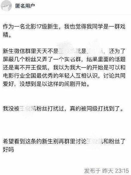中戏的新生也匿名在知乎上发帖,表示王俊凯已经影响到了学校的学术氛围。