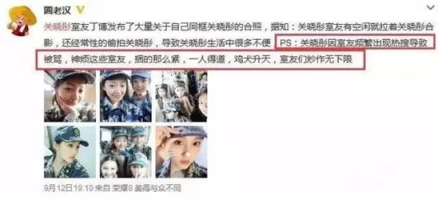 可是没有很久,事情就不一样了,虽然和关晓彤一个宿舍可以蹭到曝光量,也严重的影响了生活,合影里有关晓彤被说蹭热度,没有关晓彤又被说室友一起孤立她。