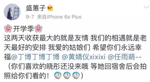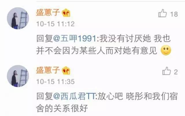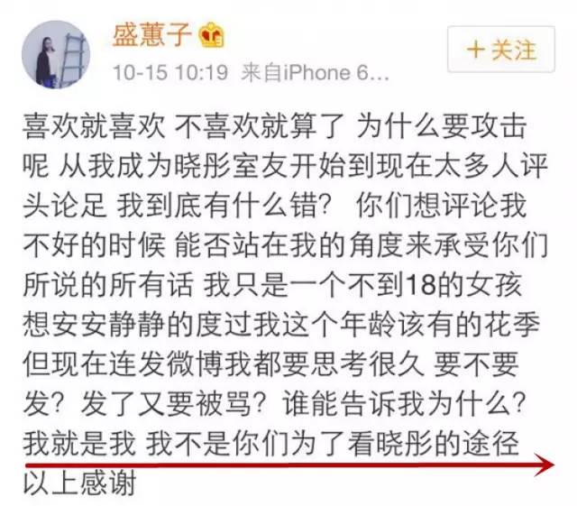 然后小姑娘们就立马炸了,一位室友盛蕙子就发了一条言辞激烈的微博,表示要安安静静度过自己的花季,难以忍受大家的评头论足,强调她不是大家“观看关晓彤的途径”,毕竟大家都是独立的个体。