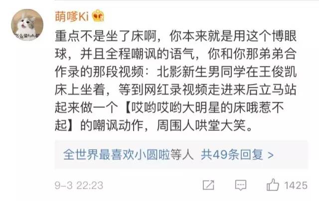 其实网红坐了自己家爱豆的床,真爱粉有点不开心可以理解,但是能掀起骂战,肯定不简单。你坐就坐,直播就直播,你能不能不乱开嘲讽模式,你真当人家粉丝是死的啊!