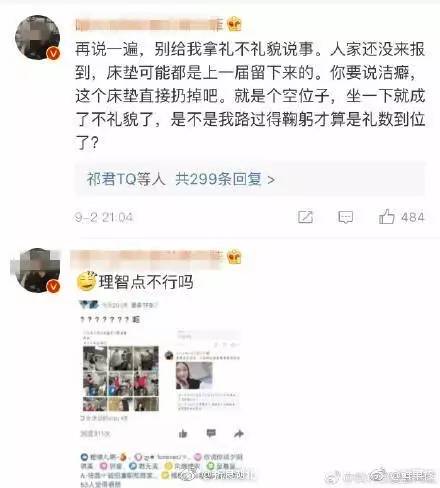 被撕了之后,网红也没客气,立马表示这帮都是脑残粉。说自己并没有不礼貌,床垫有可能是上一届留下的,真是有洁癖也可以扔掉!而自己也没有蹭热度。