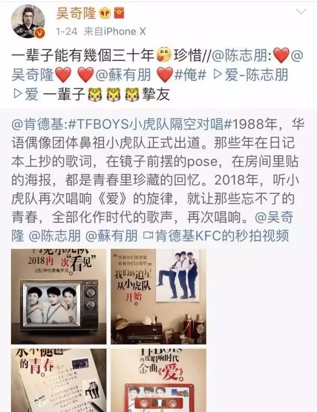 看了吴奇隆的微博才发现,原来今年是小虎队出道三十周年,他们和tfboys一起隔空合唱了当年的主打歌《爱》,也算是一种不一样的传承吧。