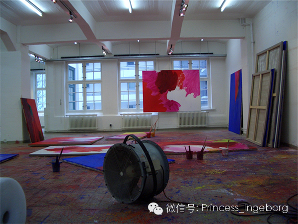 走进她位于汉堡的工作室,就会发现,整间工作室形似一间体育馆。玻璃天窗使得光线涌入,照亮油漆四溅的地砖,制造出一种类似彩色沙漠爆破后形同骤雨的效果。一整排的大型画作靠在墙壁上,等待它们最后的确定性笔触。