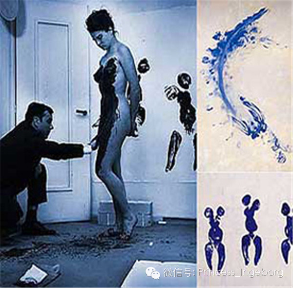 在克莱因的有形的作品中,尤为著名的是在巴黎国际当代艺术画廊的《蓝色时代的人体测量》表演艺术作品。三个美丽的裸体女模特儿涂上颜料,然后听从指挥在铺在地面上的画布上翻滚拖拉,或在挂在墙上的画布上贴靠按压,将身体形态和姿势的痕迹留在画布上。
