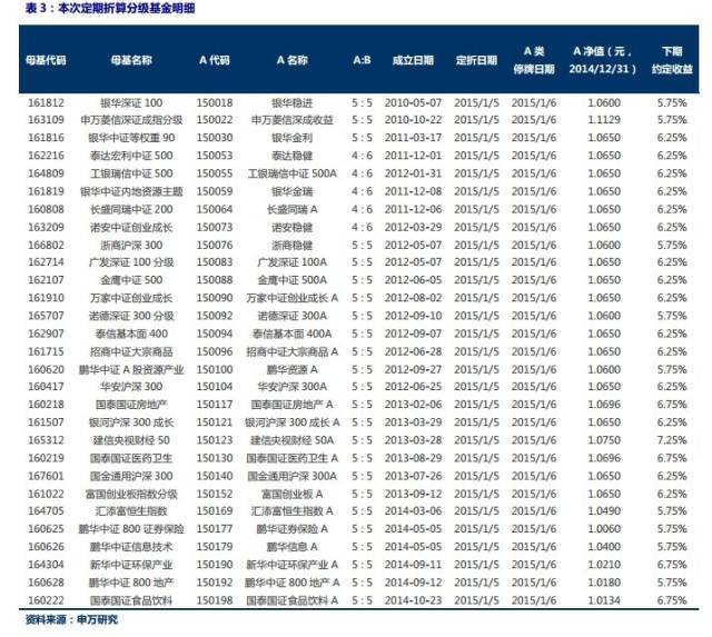 答:贴个股票指数分级A类折算名单,合计29只。它们对应的母基5日、6日都别申购赎回啦,也别整什么合并分拆啦。7日再来哦!数据整理来自申万研究所。看不清楚就点一下图片,会放大。