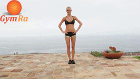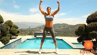 双腿做开合跳,同时手臂向上伸直,再回到与肩同高的位置