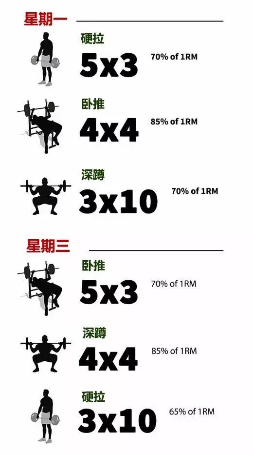 周一:硬拉(力量)、卧推(增肌)、深蹲(混合)