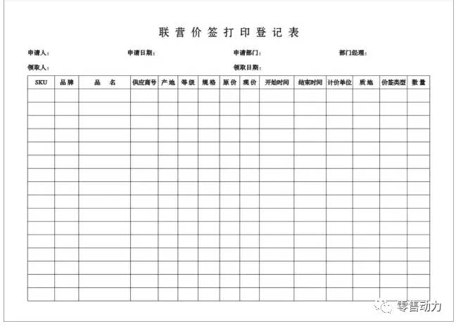 3002 部门经理签字审核《联营价签打印登记表》后签字确认,联营供应商促销员将《联营打印价签登记表》及空白价签纸交商品部价签员。