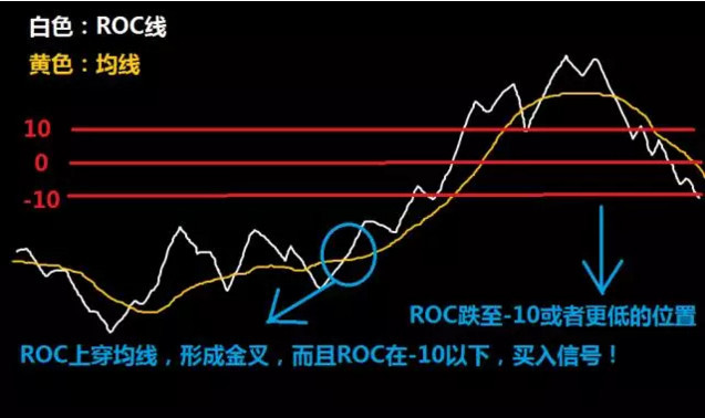 当ROC跌至-10大概更低的位置,ROC指标自下而上穿越指标均线,出现金叉,则买点出现,是买入的时机,通常短线会有一波的涨幅。要是金叉出如今-20位置处,则买点的可靠性更大。