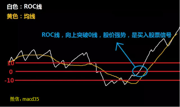 当ROC指标升至0值上方,表示当天的收盘价已经超过了12个交易日的收盘价,说明股价走势转强,是一个买入的信号。