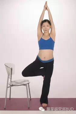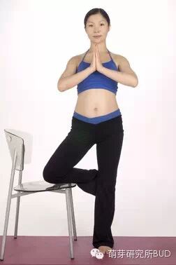 双腿并拢站直,弯曲右腿,脚心靠在左腿内侧。右腿可靠在椅子上,帮助保持平衡。两手合十于胸前,吸气,两臂向上伸展。保持呼吸。呼气时放松下落,换边。