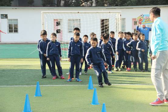 (图:苏宁志愿者带领孩子们进行带球训练)