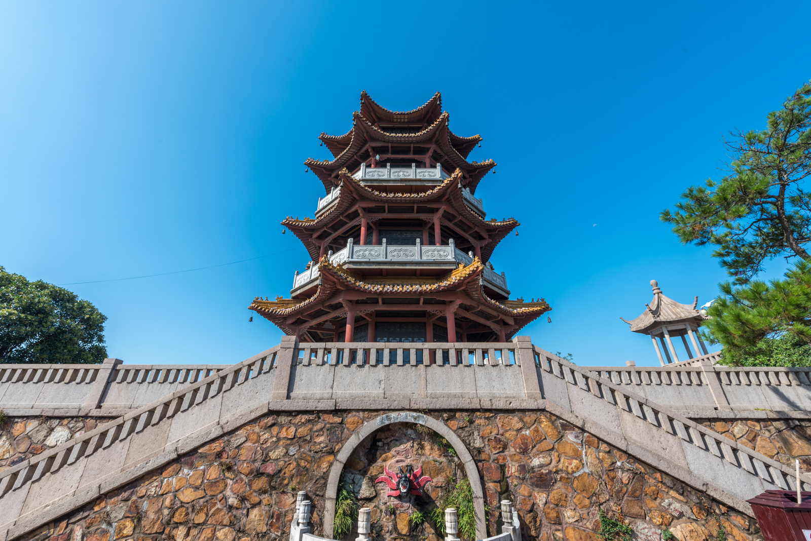 如果第二天天气晴好,不如早早起床到鹿顶山看日出。鹿顶山是太湖鼋头渚景区的制高点,鹿顶山高96米,山顶建有舒天阁,可登顶赏景,欣赏浩瀚的太湖和蠡湖。