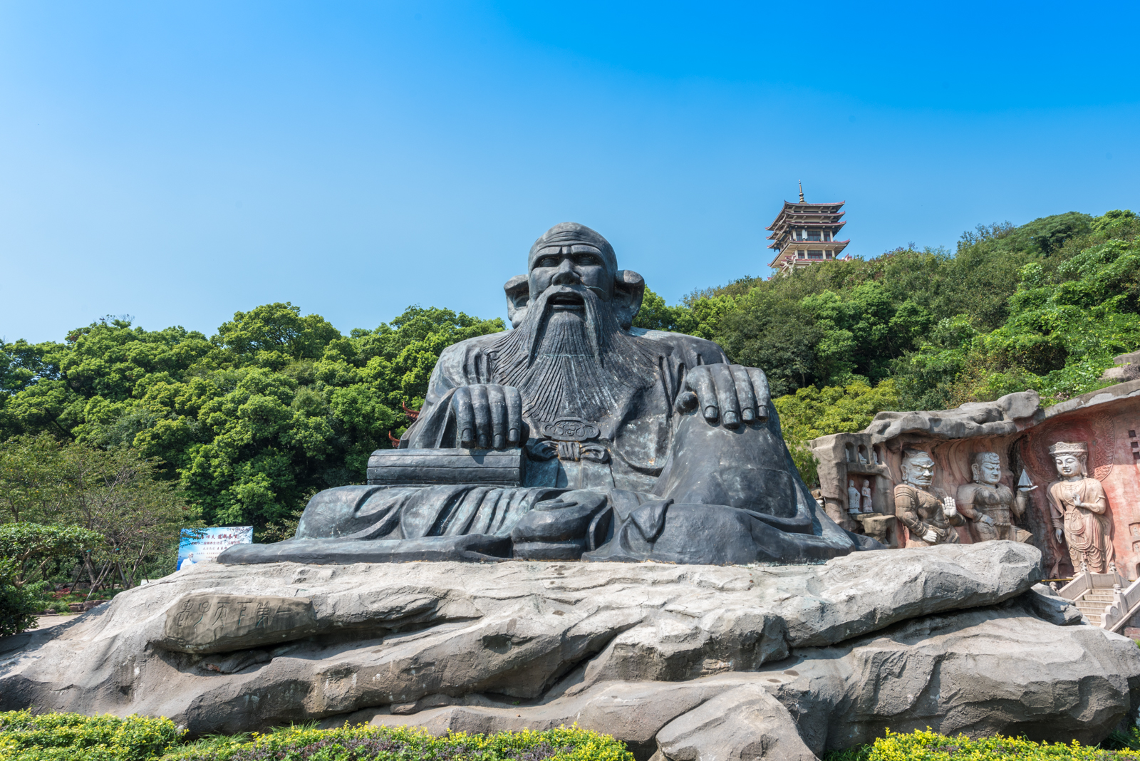 老子的塑像,复制于福建泉州清源山,老子被认为是道教的始祖,旁边的佛像则是仿制于洛阳龙门石窟。