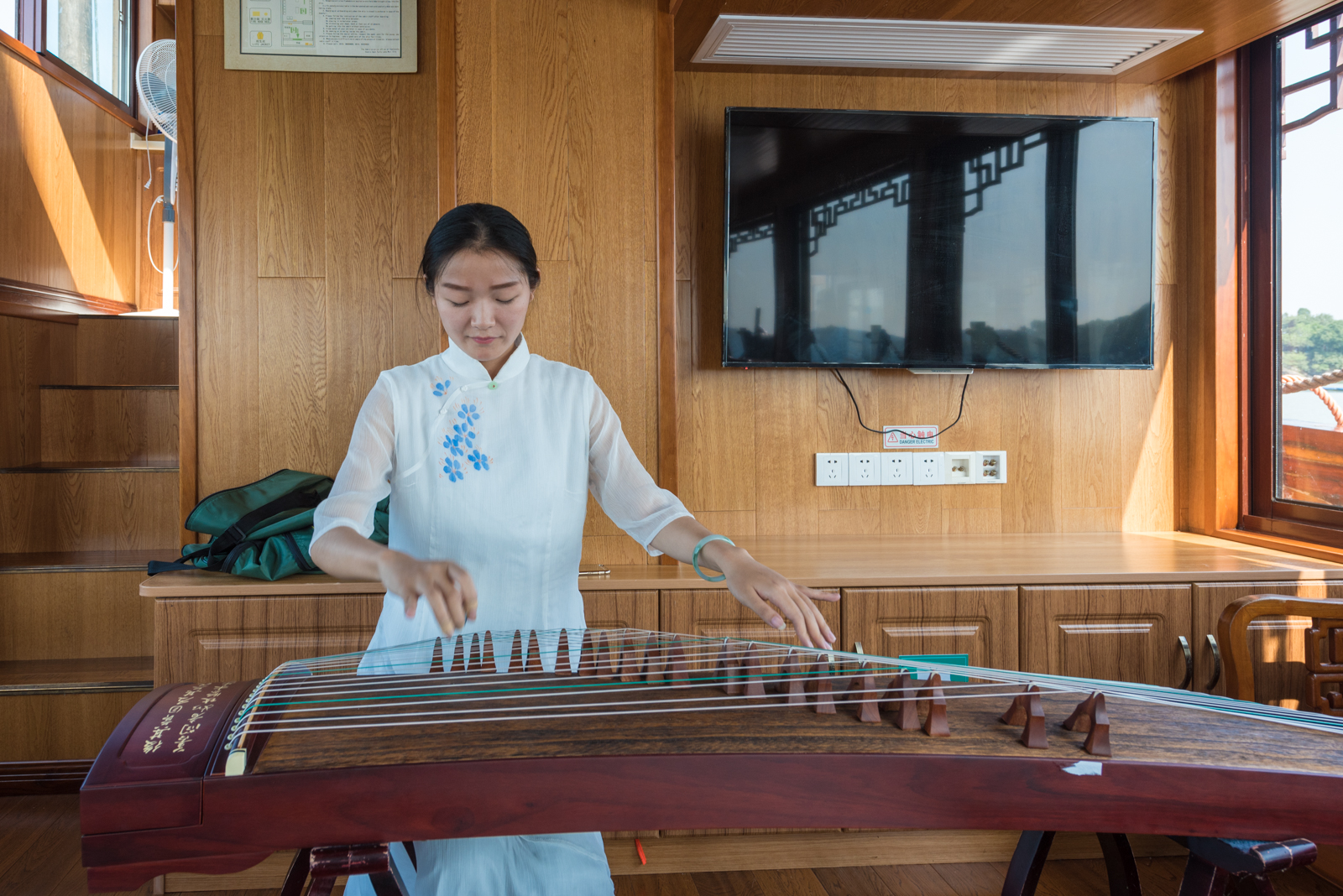 乘坐七桅帆船游览太湖更有韵味,船舱中古装美女弹奏古筝,让人听得如痴如醉。