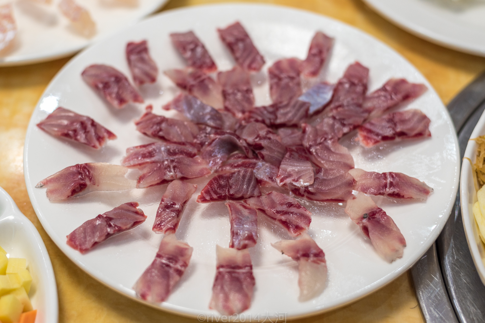 要保持鱼鲜嫩的口感,从活鱼到上餐桌不超过10分钟,才能最大程度的感受到鱼肉的鲜美。鱼肉要切成薄片,薄如蝉翼近乎透明是最好的,配上姜、葱、蒜、木瓜丝、萝卜丝、柠檬丝等十多种配菜。
