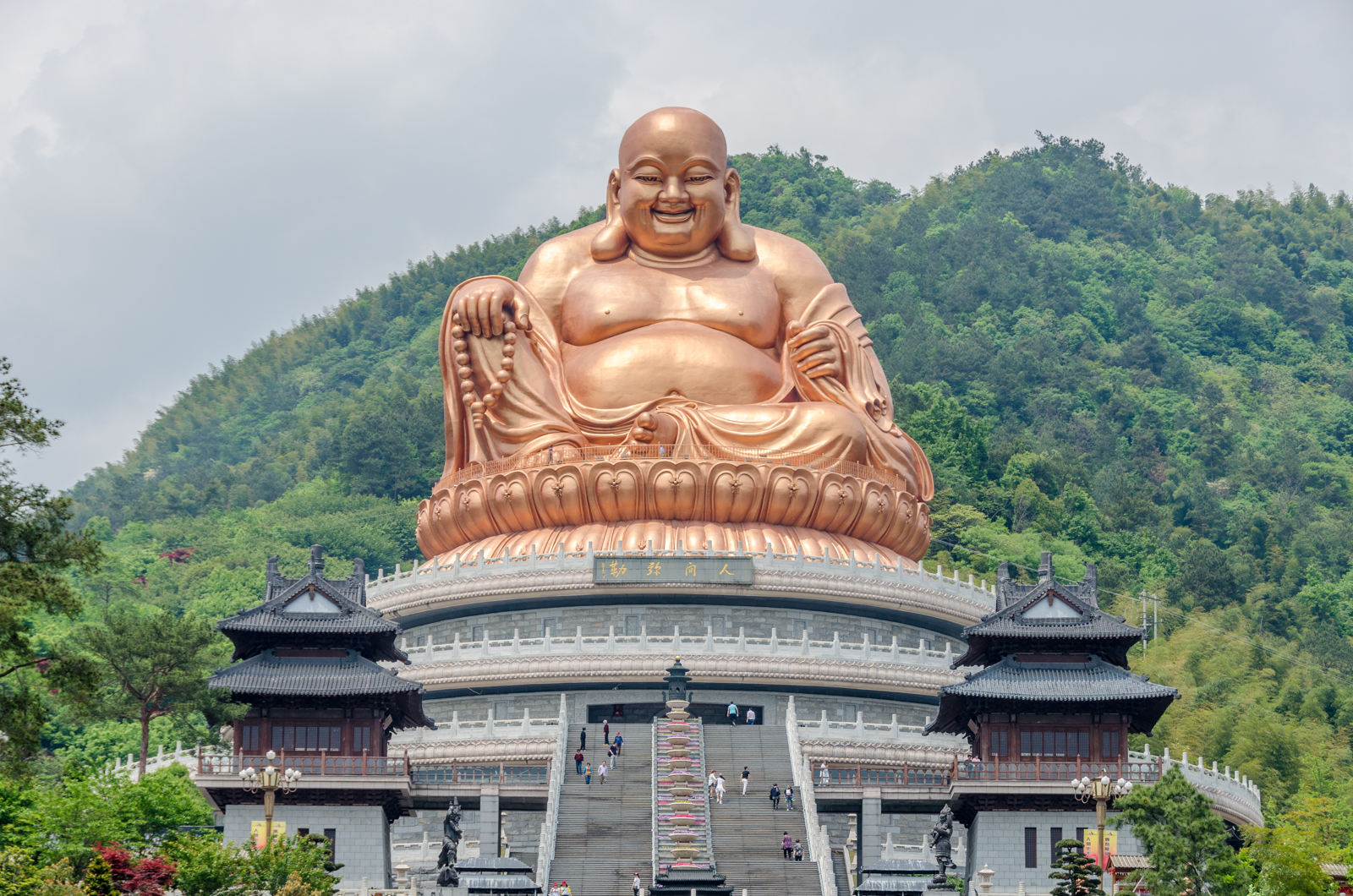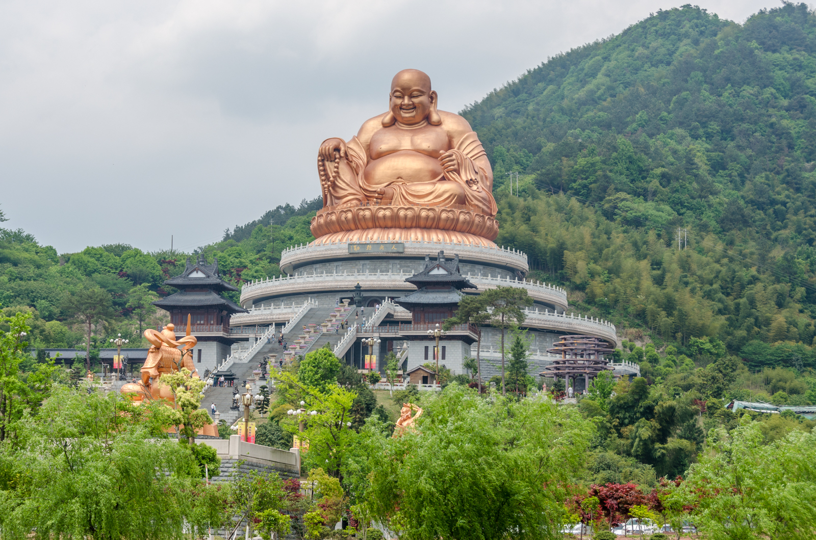 弥勒佛坐北朝南,左手提布袋,右手握佛珠,慈眉善目,笑容可掬,袒胸露腹。这是以奉化布袋和尚为造型的中国化弥勒佛像。这尊佛像高33米,莲花宝座高9米,佛像用500多吨锡青铜铸造而成。