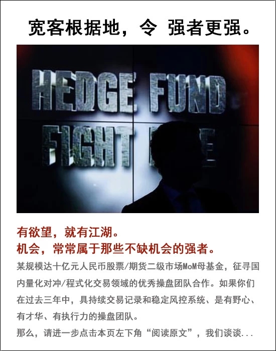 某规模达十亿元人民币股票/期货二级市场MoM母基金,征寻国内量化对冲/程式化交易领域的优秀操盘团队合作。如果你们在过去三年中,具持续交易记录和稳定风控系统、是有野心、有才华、有执行力的操盘团队。那么,请进一步点击本页左下角“阅读原文”,我们谈谈?...