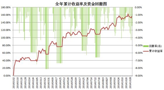 我们将图1的每月踩点收益连成全年的收益,增加本月最大回撤达到5%则平仓、月底平仓、月初重新按500万配置仓位的规则,得到最终收益率曲线如下图2,本次测试最大回撤是-8.13%,最终收益率为156.25%,收益回撤比为19.21倍,是一个非常好的商品对冲交易策略。