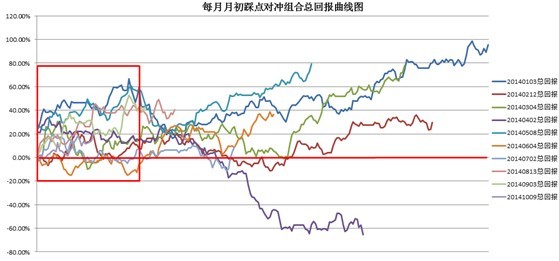 基于以上的思想,我们模拟回溯策略的收益。时间从2014年1月开始,我们选取各品种的主力合约为样本数据,涉及品种包括大豆、胶合板、玉米、鸡蛋、铜、锌、黄金等30个品种(扣除成交不活跃品种),为了说明该策略的有效性并且不建议长期持仓(因为期货有换月特点,也不可能做到长期只有某个合约),我们按每个月踩点,总资金量按500万,各品种等市值配置的方案,通过wind组合管理平台跟踪收益曲线,然后将每次进场以来的资金收益曲线放到同一个起点上,用以比较每次进场后资产变化情况,如下图1。从图1中就可以看到,大部分组合进场后都能取得正收益,更有甚者进场后几天内就能达到40%以上的收益率,只有6月份进场后出现一定的回调,但后来在取得正收益后才开始震荡下跌,这样也说明该策略不需要频繁进出,建仓后持有即可。