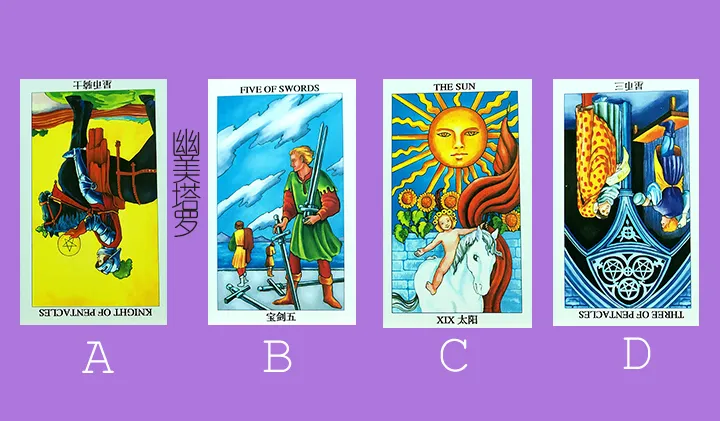 在心中想着要占卜的问题,然后凭直觉从以下四张牌中选择一张你最有感觉的塔罗牌再去看答案。注意,不要刻意挑选,不可重复选择。