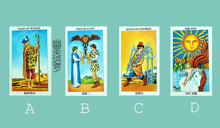在心中想着要占卜的问题,然后凭直觉从以下四张牌中选择一张你最有感觉的塔罗牌再去看答案。注意,不要刻意挑选,不可重复选择。