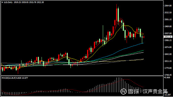 现货黄金日线图看,昨日金价呈长下影线K线,金价大跌后重新回到1900关口上方,显示金价在50日均线存在一定支撑。不过,目前5日均线方向有所朝下,并逐步与10日均线形成胶结,此处位置在金价1935美元附近,估计此处存在一定阻力压制。日线指标看,MACD指标正动能柱逐步减小,RSI指标持续在中线50位置下方徘徊。