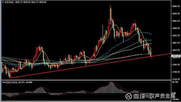 现货黄金日线图看,昨晚金价跌破200日均线支撑,金价刷新3个月以来新低。同时,金价5日均线向下逐步逼近200日均线。今日早盘金价一度快速下跌至1811美元企稳回升,但在1826美元附近遇到阻力。日线指标看,MACD指标负动能柱持续增加,RSI指标在32位置徘徊。短线看,目前金价在去年9月29日以来趋势线(如图所示)附近形成激烈争夺,如金价坚守在趋势线上方,金价将存在止跌反弹机会,否则金价将继续下探1810或1800关口。