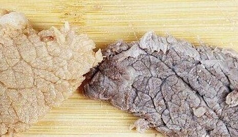 如果你已经把牛肉买回家了,那么就把牛肉煮一下吧。如果煮出来的牛肉颜色较浅,纤维不粗,那么八成是假牛肉了。牛肉的口感通常比较粗糙,你会感觉嚼起来不易烂。假牛肉则煮出来发白,肉质软嚼起来易烂。